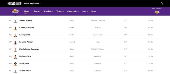 接班詹姆斯?官方:布朗尼和蒂埃羅被下放到G聯賽南灣湖人隊