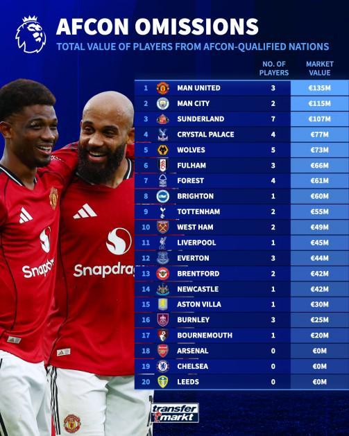北京時間11月21日,德轉(zhuǎn)列出英超20家俱樂部本屆非洲杯晉級國家球員的總身價,曼聯(lián)3人1.35億歐元第一,曼城2人1.15億歐元第二,桑德蘭7人1.07億歐元第三。